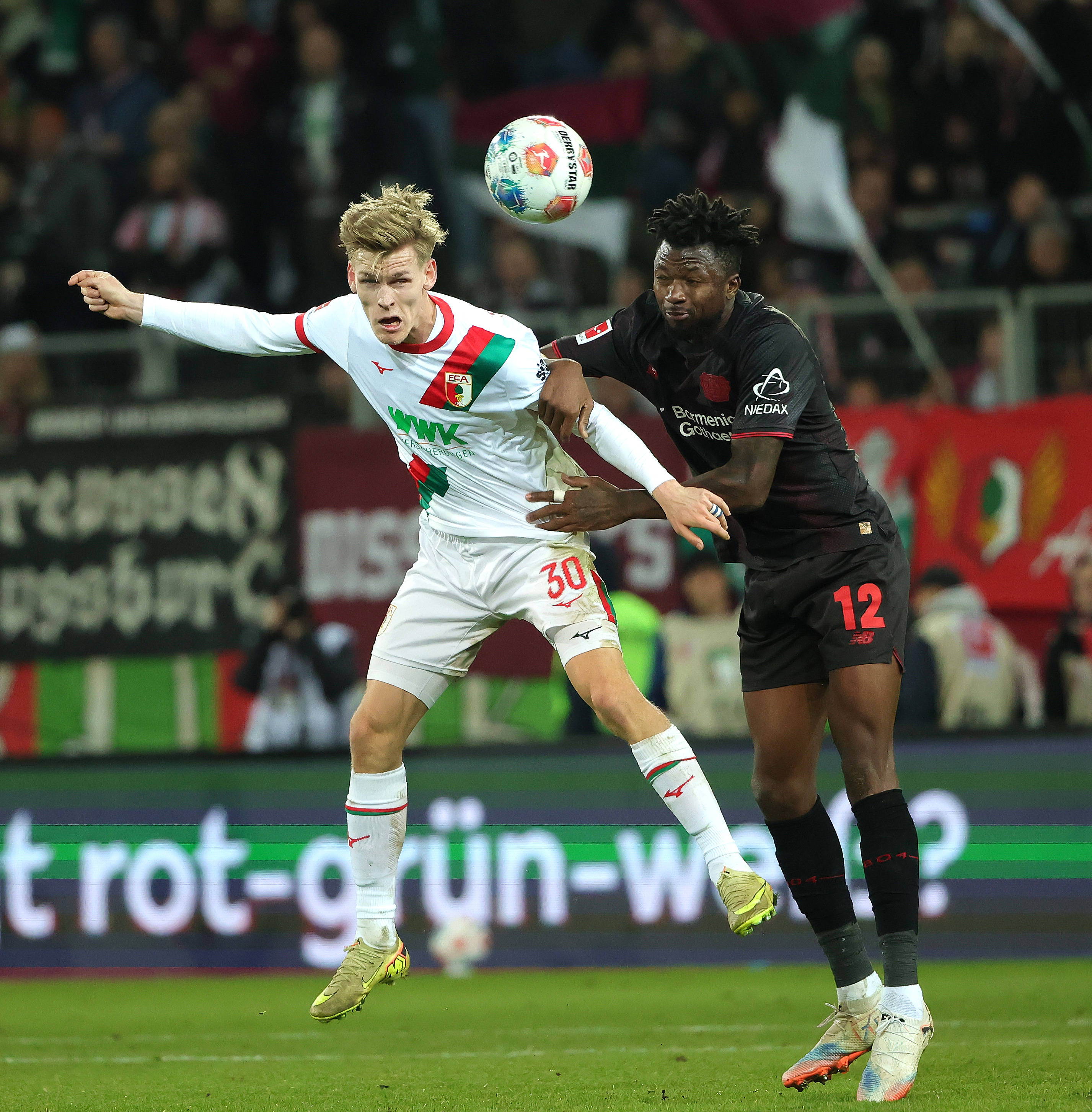 เมื่อวันที่ 6 กุมภาพันธ์ คาเดร (ซ้าย) ของเอาก์สบวร์ก และแทปโซบา ของไบเออร์ เลเวอร์คูเซ่น แย่งโหม่งลูกบอลระหว่างการแข่งขัน สำนักข่าวซินหัว (ภาพโดย ฟิลิปป์ รุยซ์)