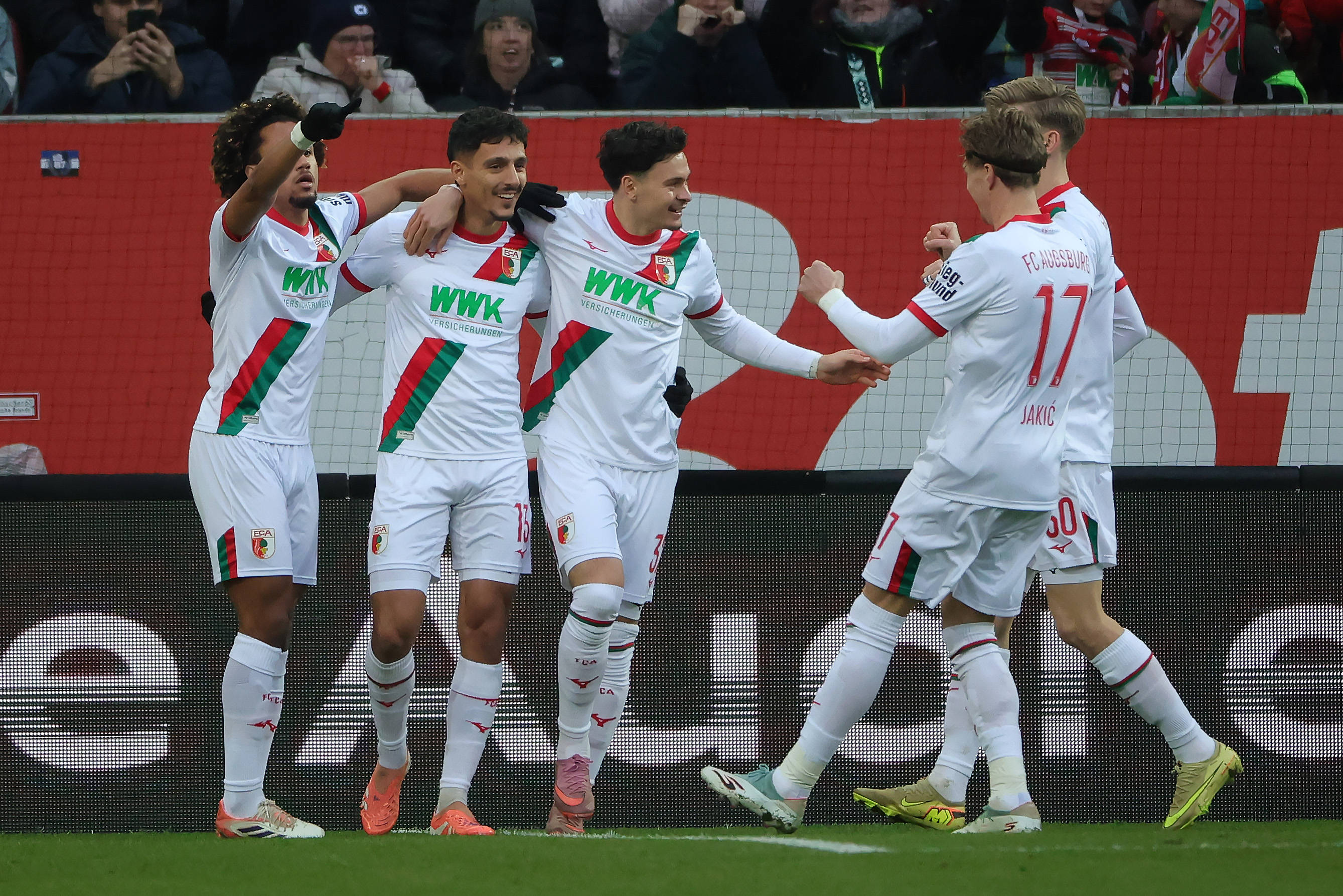 เมื่อวันที่ 6 ธันวาคม นักเตะของเอาก์สบวร์กฉลองการทำประตู สำนักข่าวซินหัว (ภาพโดย ฟิลิปป์ รุยซ์)