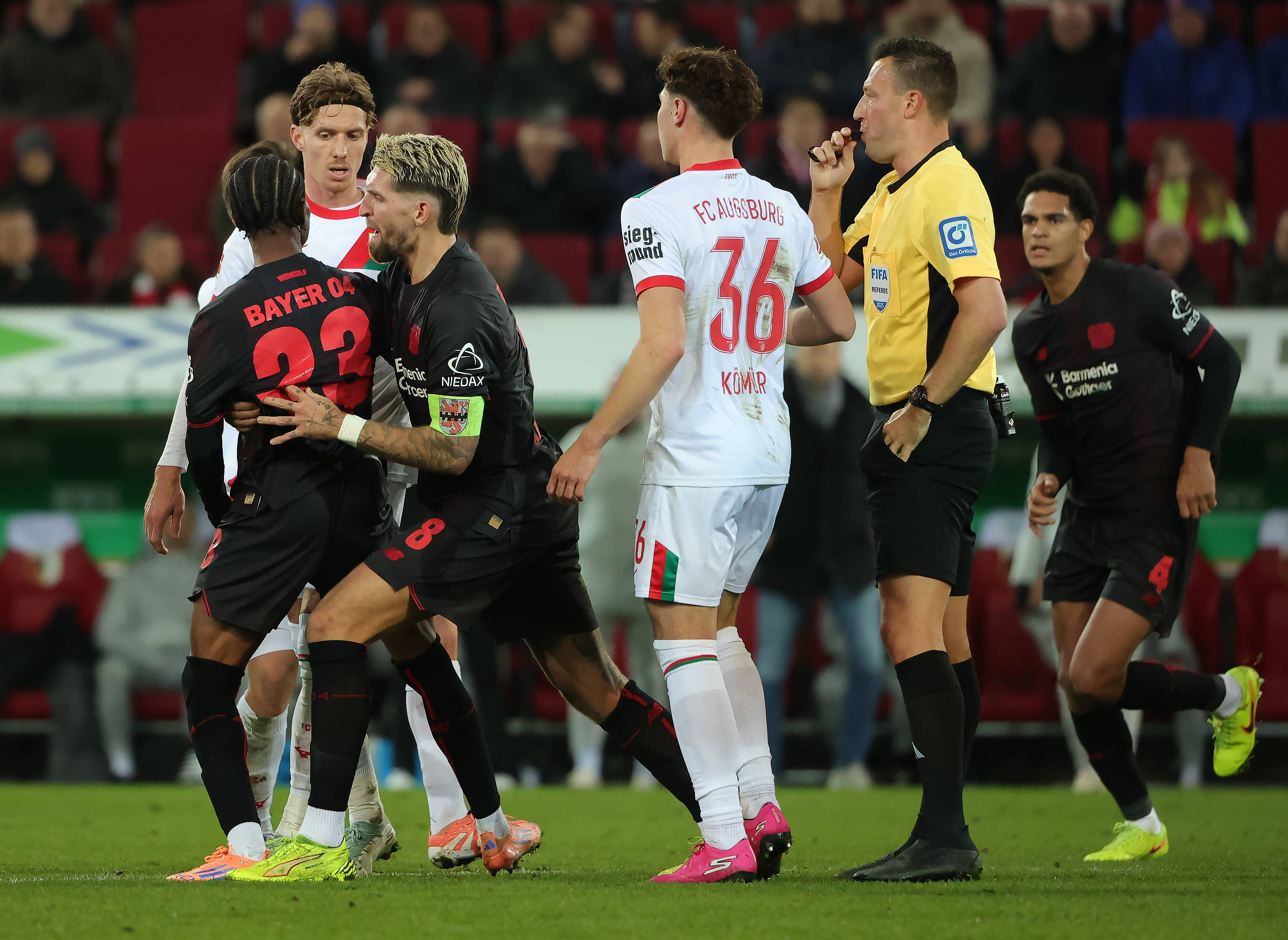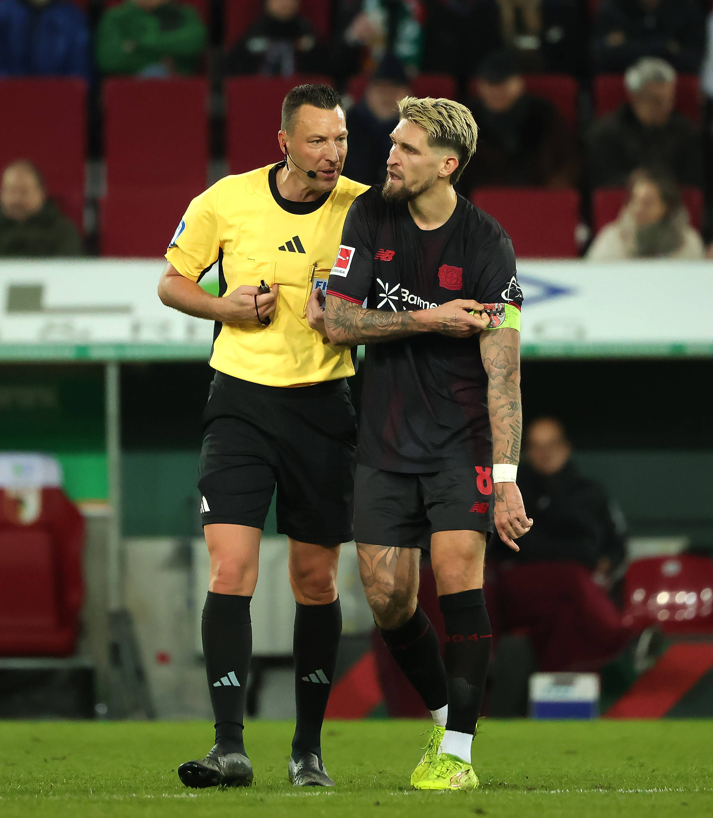 เมื่อวันที่ 6 ธันวาคม ผู้ตัดสินยาบลอนสกี้ (ซ้าย) กำลังสนทนากับอันดริช นักเตะของไบเออร์ เลเวอร์คูเซ่น สำนักข่าวซินหัว (ภาพโดย ฟิลิปป์ รุยซ์)