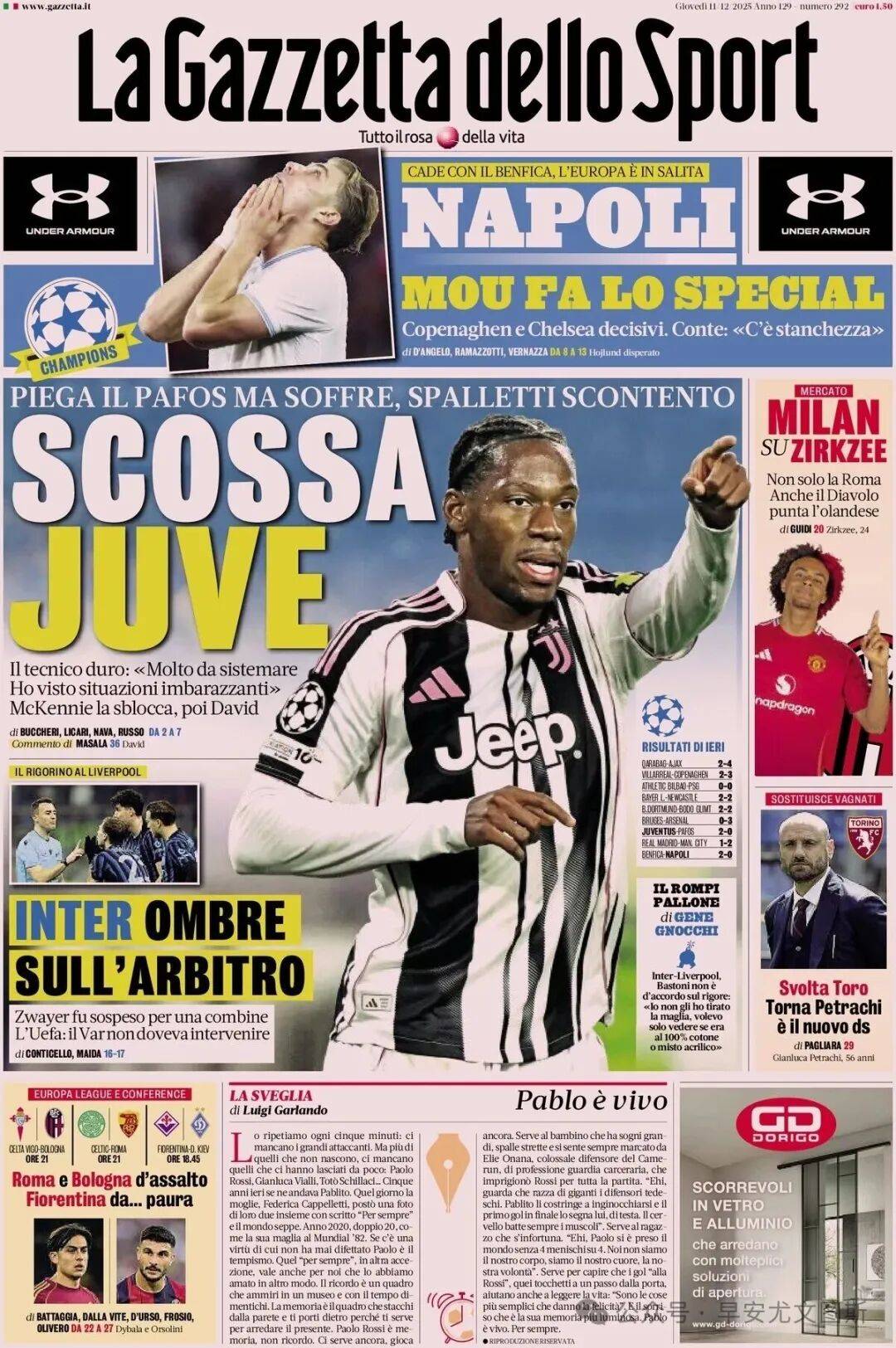 1. ยูเวนตุสสั่นสะท้าน:สปัลเล็ตติไม่พอใจหลังชนะปาฟอสแบบหืดจับ ผู้จัดการทีมกล่าวอย่างหนักแน่นว่า: "ยังมีปัญหาอีกมากที่ต้องแก้ไข ผมได้เห็นช่วงเวลาที่น่าอับอายหลายครั้ง" แม็คเคนนี่เป็นผู้ปลดล็อกเกม จากนั้นเป็นเดวิด