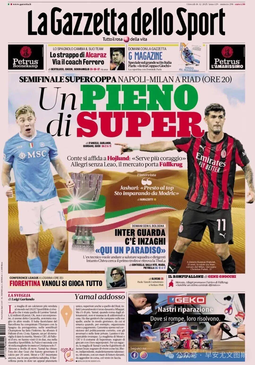 1. การแสดงต่อหน้าชีคแห่งอาระเบีย: ซูเปอร์คัพอิตาลี รอบรองชนะเลิศนัดแรก คืนนี้ที่ริยาด นาโปลี พบ เอซี มิลาน คอนเต้หวังคว้าแชมป์สมัยที่ 10 อัลเลกรีไล่ล่าแชมป์ที่ 15 ฮอยจ์ลุนด์เผชิญหน้ากับพูลิซิชโลบอตก้าเริ่มเกม, โปลิตาโน่ประจำการในตำแหน่งแบ็คขวา, ดิ ลอเรนโซ่เสริมแนวรับ, โดยมีเอลมาสมีแนวโน้มจะได้ลงตัวจริงมากกว่าบิรัง. นคุนคูยืนยันว่าฟิลครูเกอร์ใกล้จะมาถึง. หากการแข่งขันจบลงด้วยผลเสมอ จะมีการดวลจุดโทษทันที.
