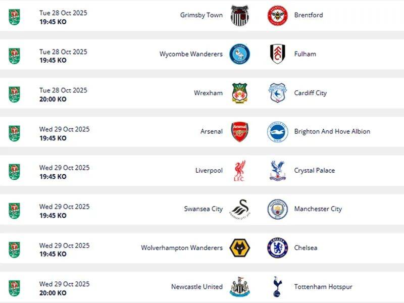 ในรอบ 16 ทีมสุดท้ายของลีกคัพ มีเพียงหนึ่งคู่เท่านั้นที่ไม่มีทีมจากพรีเมียร์ลีก โดยเป็นทีมจากลีกทูอย่างกริมสบี้ ทาวน์ เปิดบ้านรับการมาเยือนของคาร์ดิฟฟ์ ซิตี้จากลีกวัน ส่วนผลการแข่งขันคู่อื่น ฟูแล่มจะออกไปเยือนไวคอมบ์ วันเดอเรอร์สจากลีกวันเช่นกัน ขณะที่เบรนท์ฟอร์ดจะพบกับกริมสบี้ ทาวน์จากลีกสองเช่นกัน ซึ่งทั้งสองคู่เป็นการพบกันของทีมกลางตารางจากพรีเมียร์ลีกด้วยการฟอร์มอันน่าประทับใจของกริมสบี้ ทาวน์ ยังคงต้องติดตามว่าพวกเขาจะสามารถรักษาผลงานอันยอดเยี่ยมนี้ต่อไปได้หรือไม่
