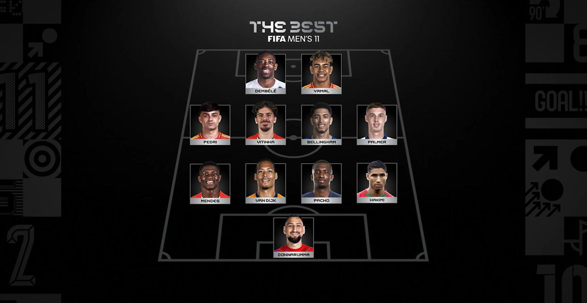 จานลุยจิ ดอนนารุมมา; อาราฟี ฮาคิมี, วิลเลี่ยน ปาโช่, เวอร์จิล ฟาน ไดจ์ค, นูโน เมนเดส; โคล พาลเมอร์, วิตินโญ่, จู๊ด เบลลิงแฮม, เปดรี้; ลามิน ยามาร์, อุสมาน เดมเบเล่